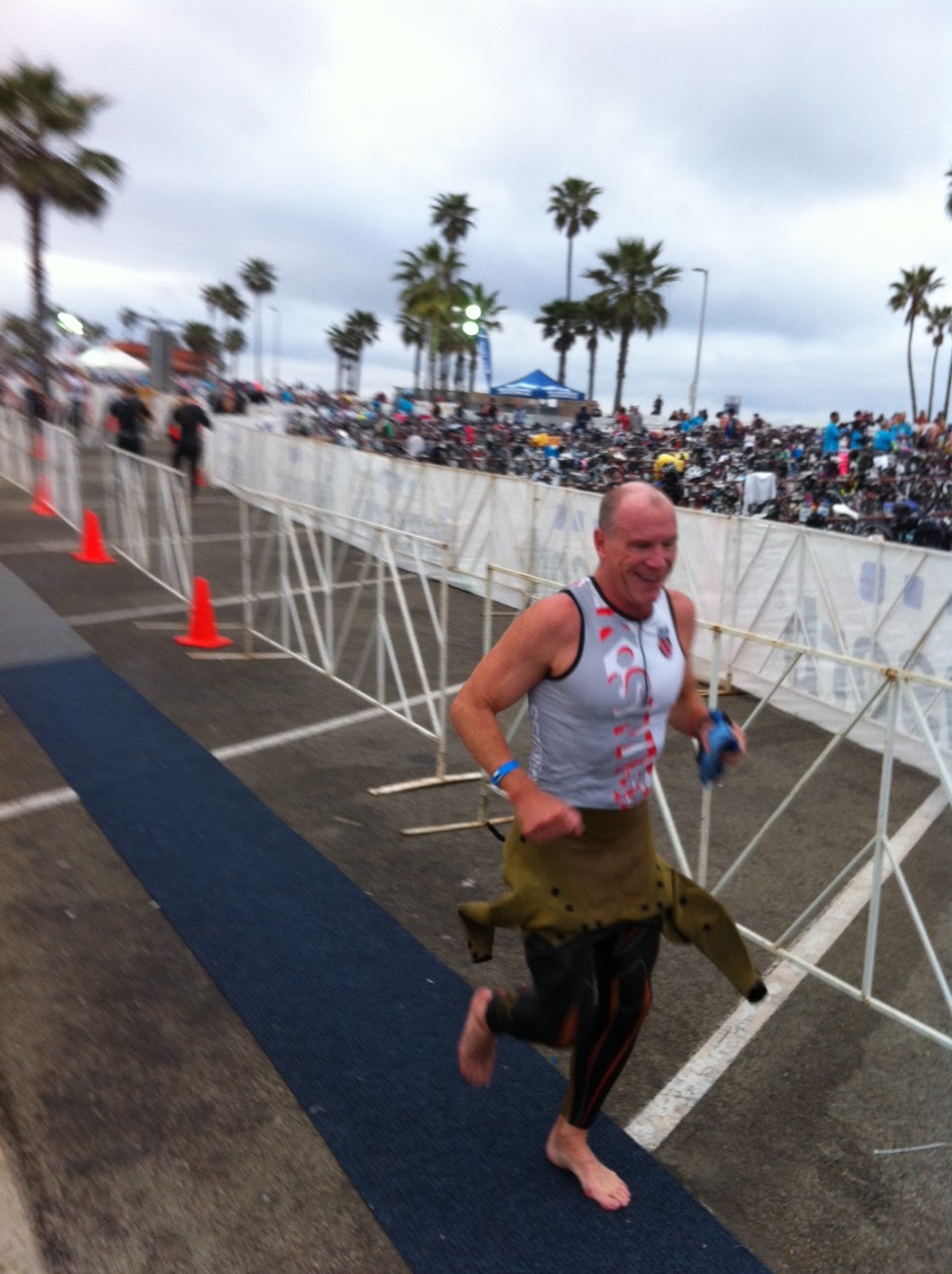 In T2, I had a lot to strip off to get ready for the run. My chest was feeling tight, and I thought it might be my singlet so I took that off and put on a running tshirt to keep my shoulders warm plus arm warmers and a hat. In t2 there were two guys sitting there just staring into the void--they looked like they had been there for an hour and they weren't going anywhere--now I know what a zombie looks like.